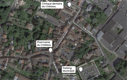 • Pour vous rendre au Groupe Dentaire, prenez le chemin qui donne accès à la rue Adeline et dirigez-vous vers la rue Maréchal Leclerc. Le cabinet se trouvera vers la droite.